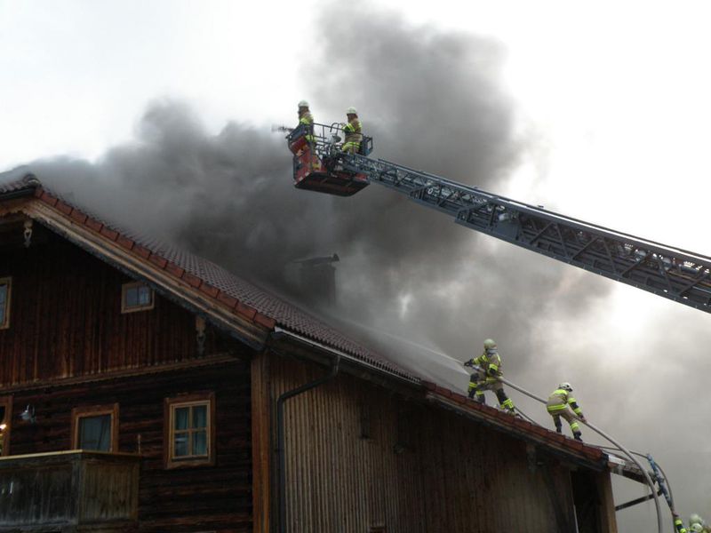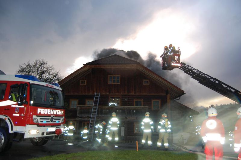 Pumpe Abtenau war gerade am Weg zum Hochwassereinsatz am Radochsberg, als von Florian Tennengau die Einsatzmeldung über einen Dachstuhlbrand nach Blitzschlag im Ortsteil Lindenthal eintraf. In Abtenau wurde somit wieder Sirenenalarm ausgelöst. Tank und Rüstlösch Abtenau, die sich noch beim Einsatz im Ortsteil Au befanden, rückten ebenfalls unverzüglich zum Brand ab. Als Pumpe Abtenau beim Brandobjekt eintraf, schlugen bereits Flammen aus dem Dach. Beim nahegelegenen Schönerbach wurde eine Saugstelle eingerichtet und eine Löschleitung mit 2 Rohren aufgebaut. Durch die starke Rauchentwicklung und den bereits ausgedehnten Brand ließ der Einsatzleiter Alarmstufe 2 auslösen. Somit wurde auch der Löschzug Voglau alarmiert. Nachdem die restlichen Einsatzmannschaften der FF Abtenau eintrafen, konnte mit einer effektiven Brandbekämpfung unter schwerem Atemschutz begonnen werden. Mehrere Trupps löschten mit mehreren Rohren und öffneten das Dach großflächig, um an den Brandherd zu gelangen. Zwei Atemschutztrupps kontrollierten das Gebäude im Inneren und löschten ebenfalls. Das Atemschutzfahrzeug des Bezirkes wurde aufgrund der benötigten Menge an Atemschutzflaschen ebenfalls alarmiert. Bereits nach 45 Minuten konnte Brandaus gegeben werden! Danach mussten noch umfangreiche Sicherungsmaßnahmen getroffen werden. Nach genauer Kontrolle mit der Wärmebildkamera wurden die offenen Dachflächen mit Planen abgedeckt. Nach rund 2,5 Stunden konnte der Einsatz beendet werden. Der Schaden am neu renovierten Wirtschaftsgebäude, das als Wohnhaus und Werkstatt genützt wird, ist groß, hält sich aber durch den geringen Wasserschaden in Grenzen. Die Familie konnte die Nacht im betroffenen Haus verbringen. Um 24.00 Uhr und am Morgen des 4. Mai wurden von der Feuerwehr Nachkontrollen durchgeführt.