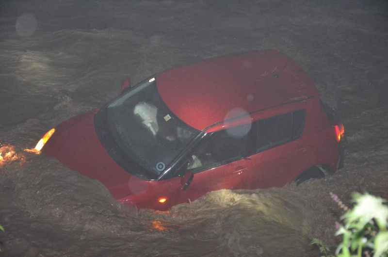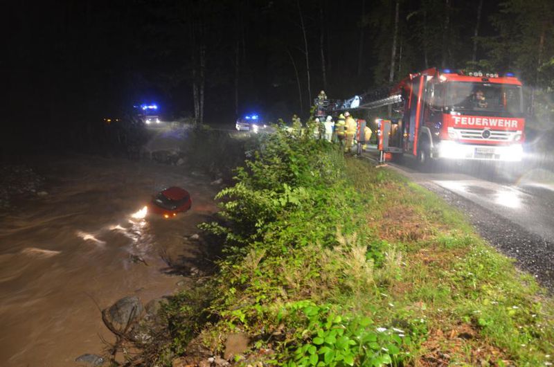 Montagnacht fuhr ein PKW Lenker am Lammerweg 2 von Abtenau in Richtung Annaberg. Nach einer Kurve kam der Wagen von der regennassen Fahrbahn ab und stürzte anschließend über die steile Straßenböschung in die hochwasserführende Lammer. Bei diesem Unfall überschlug sich das Fahrzeug und kam glücklicher Weise auf den Rädern zum Stillstand. Der Fahrer, der sich alleine im Fahrzeug befand, konnte sich trotz Hochwasser und Dunkelheit an das Ufer der Lammer retten und alarmierte vom ca. 1,5 Kilometer entfernten Asylheim die Rettungskräfte. Die Feuerwehr Abtenau rückte daraufhin mit Rüstlösch und Tank zum Einsatz ab. Die Drehleiter Abtenau befand sich gerade am Rückweg vom Einsatz in Annaberg und fuhr ebenfalls die Unfallstelle an.