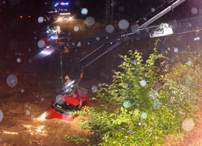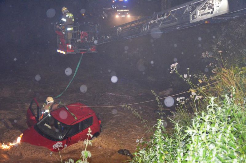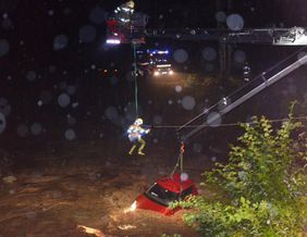 Nachdem die Unfallstelle ausgeleuchtet war, konnte von der Drehleiter ein Feuerwehrmann zum Fahrzeug gehievt werden, der die Bergegurte am PKW anbrachte. Der zwischenzeitlich eingetroffene Kran konnte den PKW aus der Lammer heben, bevor dieser weiter abgetrieben wurde.