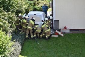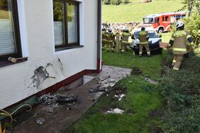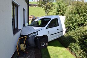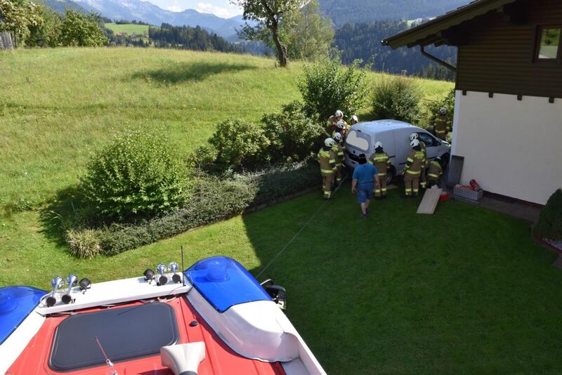 Heute Nachmittag prallte ein führerloses Auto, welches rund 200 Meter weit über einen Hang rollte, gegen eine Hausmauer. Durch den Aufprall wurden sowohl der Wagen als auch die Mauer stark beschädigt. Die Feuerwehr zog den Wagen mit der Einbauseilwinde von der Hausmauer weg und dichtete den abgebrochenen Außenwasserhahn ab. Danach wurde der Wasserschieber geschlossen und der Wagen auf den Vorplatz des Wohnhauses gezogen. Der erst später eingetroffene Hausbesitzer kontrollierte mit dem Einsatzleiter den ebenfalls beschädigten Innenraum. Im Keller entstand zum Glück kein Wasserschaden.