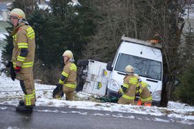 Ein Firmenwagen blieb aufgrund der schneeglatten Fahrbahn auf der alten Kohlhofstraße hängen. Daraufhin versuchte der Lenker das Fahrzeug zurück zu setzen. Der Klein LKW (3,5t) mit Anhänger rutschte dabei rückwärts und in weiterer Folge von der steilen Straße. Der Fahrer reagierte richtig und sprang noch aus dem Wagen. Das Fahrzeug kam nach ca. 10 Metern an einem Baum zum Stillstand. Der mitgeführte Anhänger löste sich vom Fahrzeug und stürzte um.