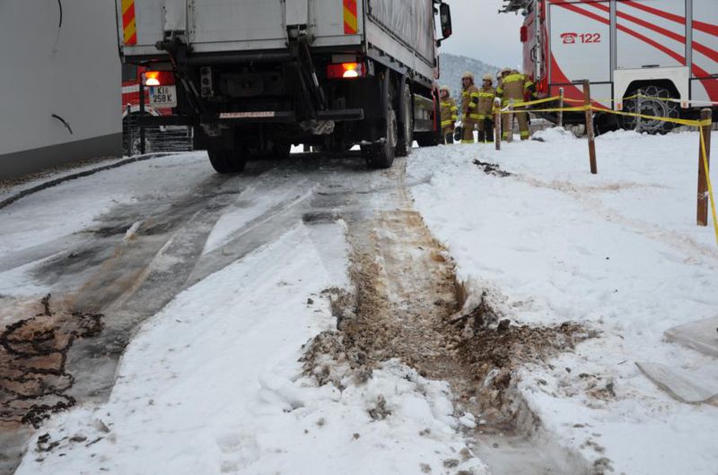 An diesem Vormittag kam ein beladener LKW bei einem Neubau im Ortszentrum beim Rückwärtsfahren auf der abschüssigen Einfahrt ins Rutschen und geriet dabei neben die asphaltiere Straße. Versuche des Fahrers den LKW wieder frei zu bekommen scheiterten. Die alarmierte Feuerwehr konnte den LKW mit der Einbauseilwinde des Rüstlöschfahrzeuges durch Umlenken beim Tanklöschfahrzeug rasch bergen.