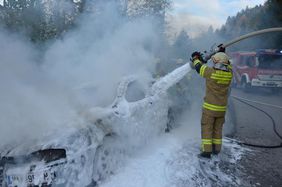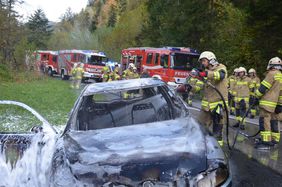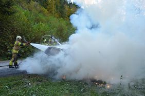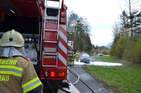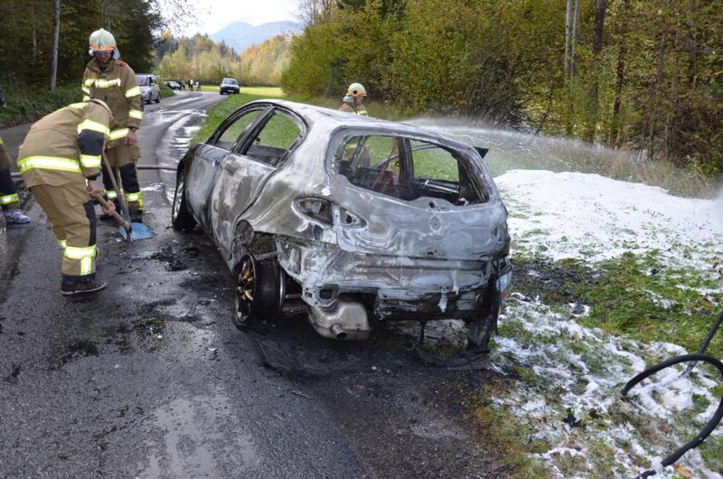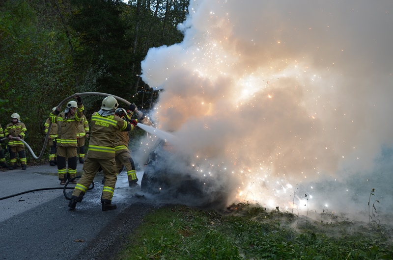 An diesem Sonntag wurde die FF Abtenau um 14.06 Uhr über Sirene und Rufempfänger zu einem Fahrzeugbrand bei der Lammererbrücke am Lammerweg 1 alarmiert. Ein Lenker bemerkte während der Fahrt leichten Rauch aus den Lüftungsschlitzen dringen und hielt sein Fahrzeug darauf hin an. Kurze Zeit später wurde der Rauch stärker, sodass der Mann zu einem nahen Haus rannte, den Notruf absetzte und einen Feuerlöscher holte. Als der Mann wieder zu seinem Wagen kam, stand dieser bereits in Vollbrand. Die Feuerwehr bekämpfte den Brand mit einem Schaum- und einem HD-Rohr, konnte aber nicht verhindern, dass das Auto komplett ausbrannte. Pumpe Abtenau baute am der nahen Lammer eine Saugstelle auf und versorge Tank und Rüstlösch Abtenau mit Löschwasser. Nachdem der Brand gelöscht war, wurde die Fahrbahn gereinigt und der Schaum beseitigt. Danach half die Feuerwehr noch beim Verladen des Fahrzeuges auf einen Abschleppwagen.