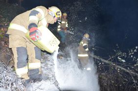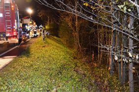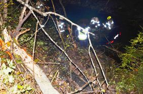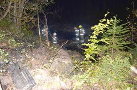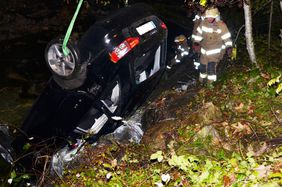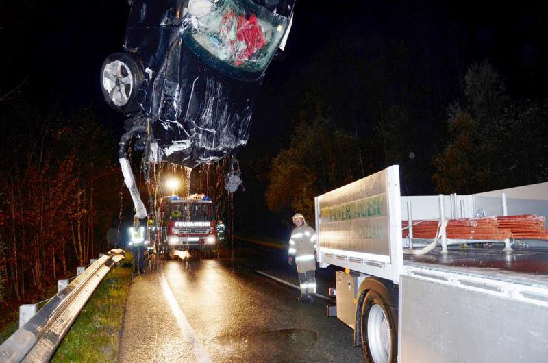 Ein Autolenker hatte bei einem schweren Verkehrsunfall großes Glück. Sein Wagen kam auf der Fahrt in Richtung Rußbach von der Bundesstraße ab, fällte mehrere kleinere Bäume und stürzte danach über große Steine in den Rußbach. Der PKW blieb total beschädigt am Dach liegen. Der Lenker konnte sich trotz des eindringenden Wassers aus dem Fahrzeug retten. Als die Feuerwehr an der Unfallstelle eintraf, wurde der Mann bereits vom Roten Kreuz versorgt. Somit beschränkte sich die Einsatztätigkeit der Feuerwehr auf die Verkehrsabsicherung und Bergung des Fahrzeuges. Mit der Kettensäge wurden mehrere Sträucher beseitigt und Öl gebunden. Nach dem Eintreffen des Krans begann die Feuerwehr mit der Fahrzeugbergung. Im Anschluss an die Bergung wurde noch die Fahrbahn gereinigt. Die Bundesstraße war bis ca. 06.15 Uhr nur einspurig befahrbar.