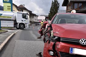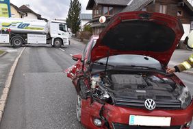 Bei der Ausfahrt einer Tankstelle kam es heute Nachmittag zu einem Zusammenstoß zwischen einem PKW und einem LKW. Entgegen der Alarmierung "Verkehrunfall mit eingeklemmter Person" handelte es sich lediglich um einen Unfall mit Blechschaden. Das Rote Kreuz musste aber eine unter Schock stehende Person behandeln. Nach der Beseitigung der Fahrzeuge wurde die Unfallstelle gesäubert und die Verkehrsregelung aufgehoben.