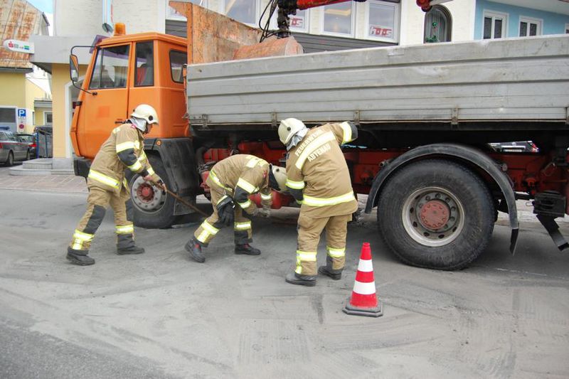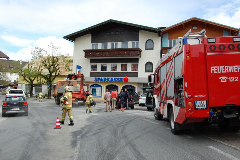 An diesem Nachmittag fuhr eine Autolenkerin im Ortszentrum rückwärts aus einer Parklücke. Dabei kam es zum Zusammenstoß mit einem vorbeifahrenden LKW. Der PKW verhakte sich beim Lastwagen und wurde ca. 20 Meter mitgeschleift. Die Lenkerin des Wagens blieb glücklicher Weise unverletzt, an ihrem Fahrzeug entstand aber Totalschaden. Da beim LKW der Hydraulikölbehälter aufgerissen wurde, liefen rund 15 Liter Öl auf die Bundesstraße. Durch den fließenden Verkehr wurde das Öl auf einer Länge von ca. 50 Metern verteilt. Die FF Abtenau sicherte die Unfallstelle ab, regelte den Verkehr und band das ausgelaufene Öl mit Ölbindemittel. Ein betroffener Kanal wurde auf eine mögliche Verunreinigung untersucht, dabei konnte aber kein Öleintritt festgestellt werden. Nachdem das Öl beseitigt war, wurde die Unfallstelle gereinigt sowie die „Ölspur“ Tafeln aufgestellt.