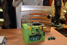 In einem praktischen Teil wurden die sicherheitsrelevanten Komponenten direkt an einem Elektrofahrzeug erklärt. Zusätzlich konnten Bauteile wie Hochvoltkabel, Batterien und Trennschalter besichtigt werden.