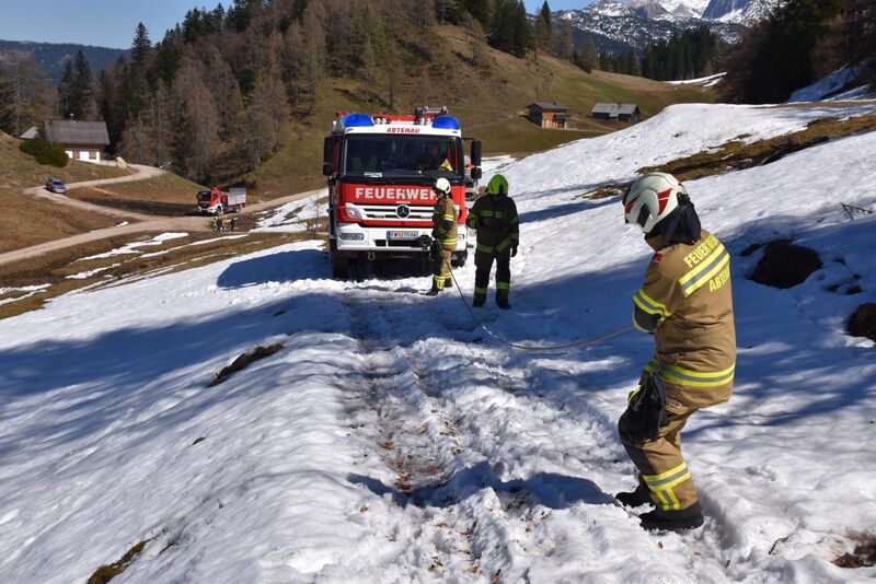 Die FF Abtenau wurde um 14:41 Uhr zu einer PKW Bergung im Ortsteil Hallseiten alarmiert. Nach Rücksprache mit der LAWZ Salzburg befand sich der Einsatzort im Abtenauer Teil des Schigebietes Dachstein West (Bereich Zwieselalm). An der Einsatzstelle fand die Feuerwehr einen Firmenwagen vor, der bei der Talfahrt über einen Almweg im tiefen Sulzschnee stecken blieb. Da die Feuerwehr aufgrund der tiefen Schneefahrbahn nicht direkt zum PKW zufahren konnte, musste die Seilwinde ganz ausgefahren und zusätzlich verlängert werden. Erst dann war die Bergung möglich. Nach einer halben Stunde war der Wagen geborgen und die Feuerwehr rückte wieder ein.