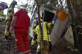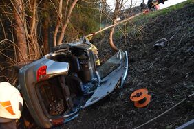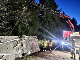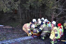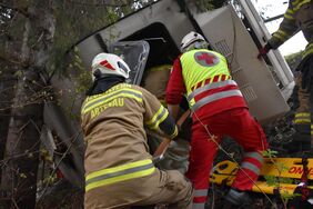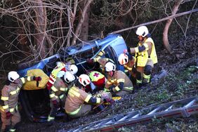 Bei dieser Einsatzübung wurde ein schwerer Verkehrsunfall, bei dem ein Wohnwagengespann in unwegsames Gelände abstürzte, angenommen. Nach der Erkundung durch den Übungsleiter wurden die Fahrzeuge mit dem Kran des Versorgungsfahrzeuges und einem Hubzug gesichert und ein 2-facher Brandschutz aufgebaut. Die Feuerwehr befreite in enger Zusammenarbeit mit dem Roten Kreuz eine eingeklemmte Person mit dem hydraulischen Rettungsgerät aus dem PKW. Zwei verletzte Personen in schwierigen Lagen mussten aus dem Wohnwagen befreit werden. Nach der Rettung der Verletzten war noch eine leblose Person (Dummy), welche unter dem PKW eingeklemmt war, mit Hilfe der Hebekissen zu bergen. Im Anschluss wurden alle Gerätschaften versorgt und der PKW sowie der Wohnwagen mit dem Kran geborgen.